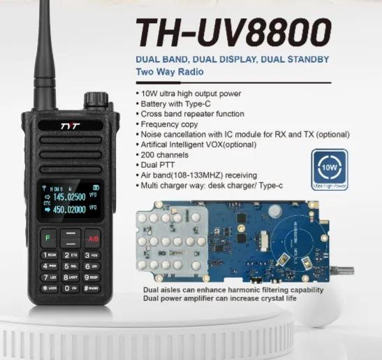 Радиостанция TYT TH-UV8800 — работает в 2 ключевых частотных диапазонах: VHF (136-174 МГц) и UHF (400-480 МГц). Также рация способна работать на прием в Авиа диапазоне. Это обеспечивает универсальность для разных условий связи.